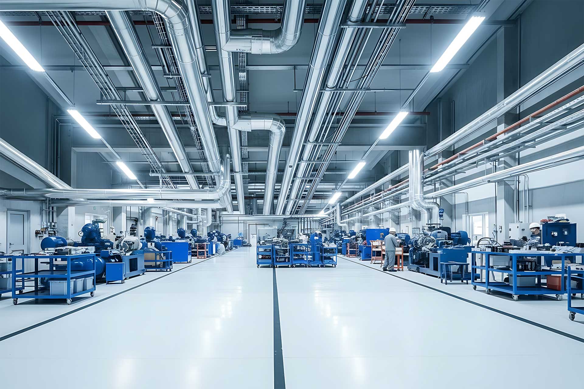 コンプレッサーの能力を最大限に発揮させるためには、適切な配管設計が不可欠です。当社は「管工事業」の建設業許可(大阪府知事 許可)を取得しており、エアー配管から冷却水配管まで、工場の規模や用途に合わせた最適な施工を行います。